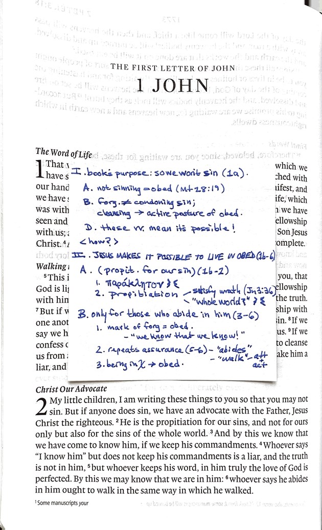 I write my outline out by hand with pencil. For me, that manual writing process helps me internalize the material in a way typing on a screen can’t. Then I really boil it down. All I need is my Big Idea, main points, and crucial subpoints. I usually squeeze in any needed cross-references and careful transitions (okay, I write really small). I also use little symbols, abbreviations, and one-word reminders to maximize space on the note. They only need to make sense to me! Everything that doesn’t make it onto the sticky notes is internalized (like the intro and conclusion for instance) and prompted by the actual words of the text as I move through it.